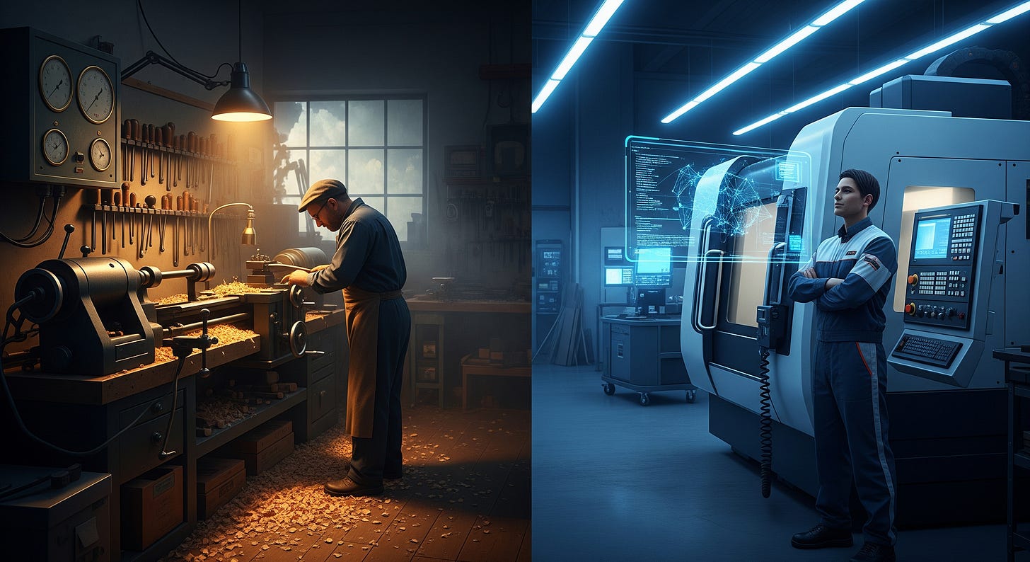 Примерно в середине года у меня был текст (и видео) примерно на эту тему — что разработка программного обеспечения, несмотря на свою прогрессивность, представляет собой последнюю область кустарного (хорошо, назовите это крафтовым) производства в истории человечества. Проблема, однако, в том, что человечеству уже нужны не гениальные мастеровые, пусть и за хорошими станками, а автоматизированные технологические линии. Правильный вайб-кодинг в данной аналогии — это оператор за станком с программным управлением. Он не выточит сложную деталь на ручном токарном станке — но составит инструкции, по которым машина изготовит деталь лучше и быстрее, чем любой токарь высшего разряда. Ваши способности по скоростному набору кода действительно утрачивают актуальность — а роль инженерного мышления и умения проектировать сложные системы только растет.