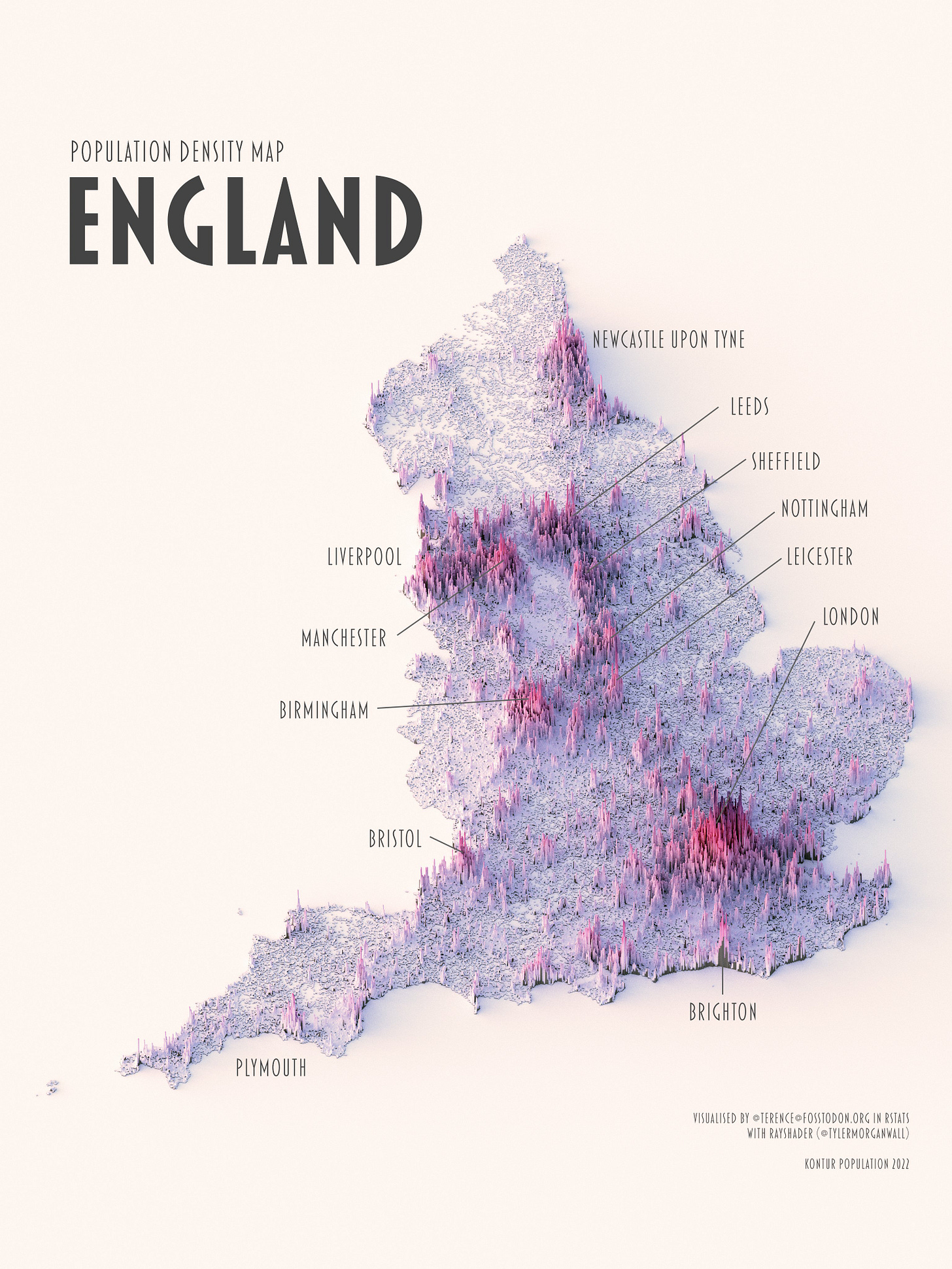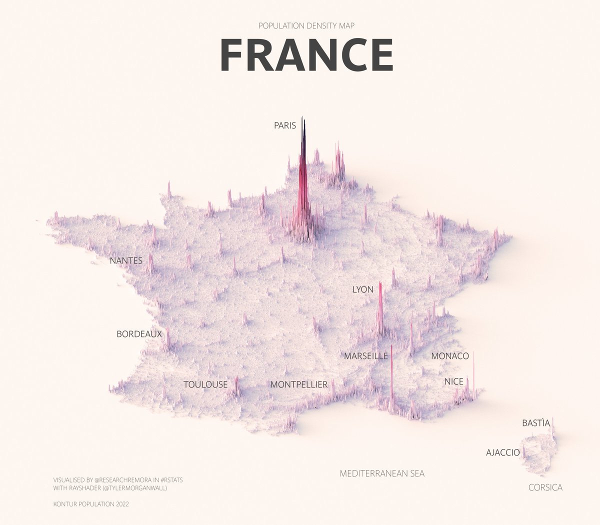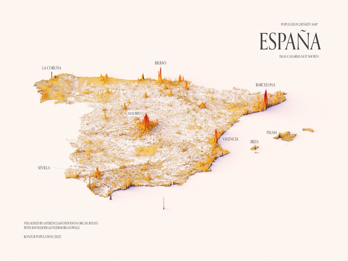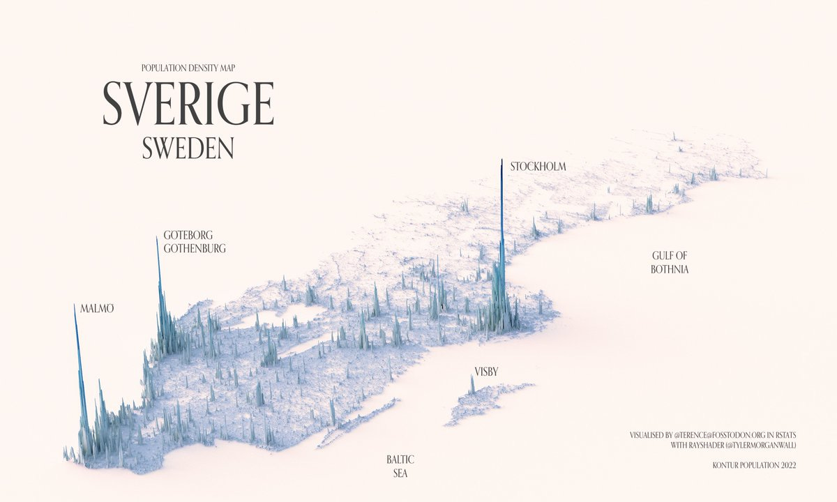 На днях наткнулся в Twitter на интересный аккаунт. Автор — аналитик, который строит прекрасные визуализации данных в привязке к картам и, в частности, целую серию таких визуализаций сделал по данным о плотности населения в различных странах мира.