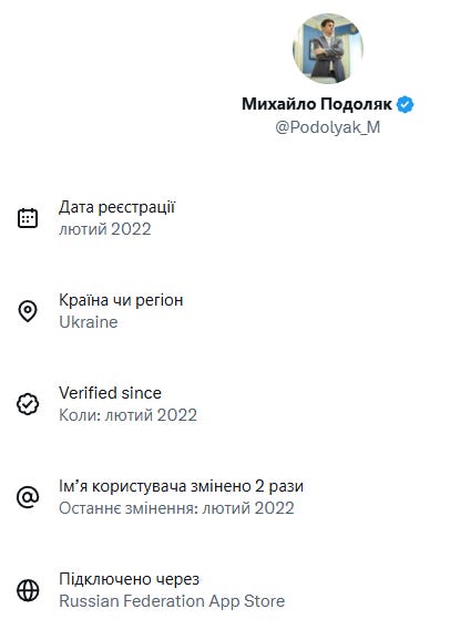 Украинский сегмент интернета предпочел ухватиться за профиль Михаила Подоляка, политтехнолога и советника главы Офиса Президента Украины, часто выступающего с официальными комментариями — у него, понимаете ли, в профиле указан российский AppStore.
