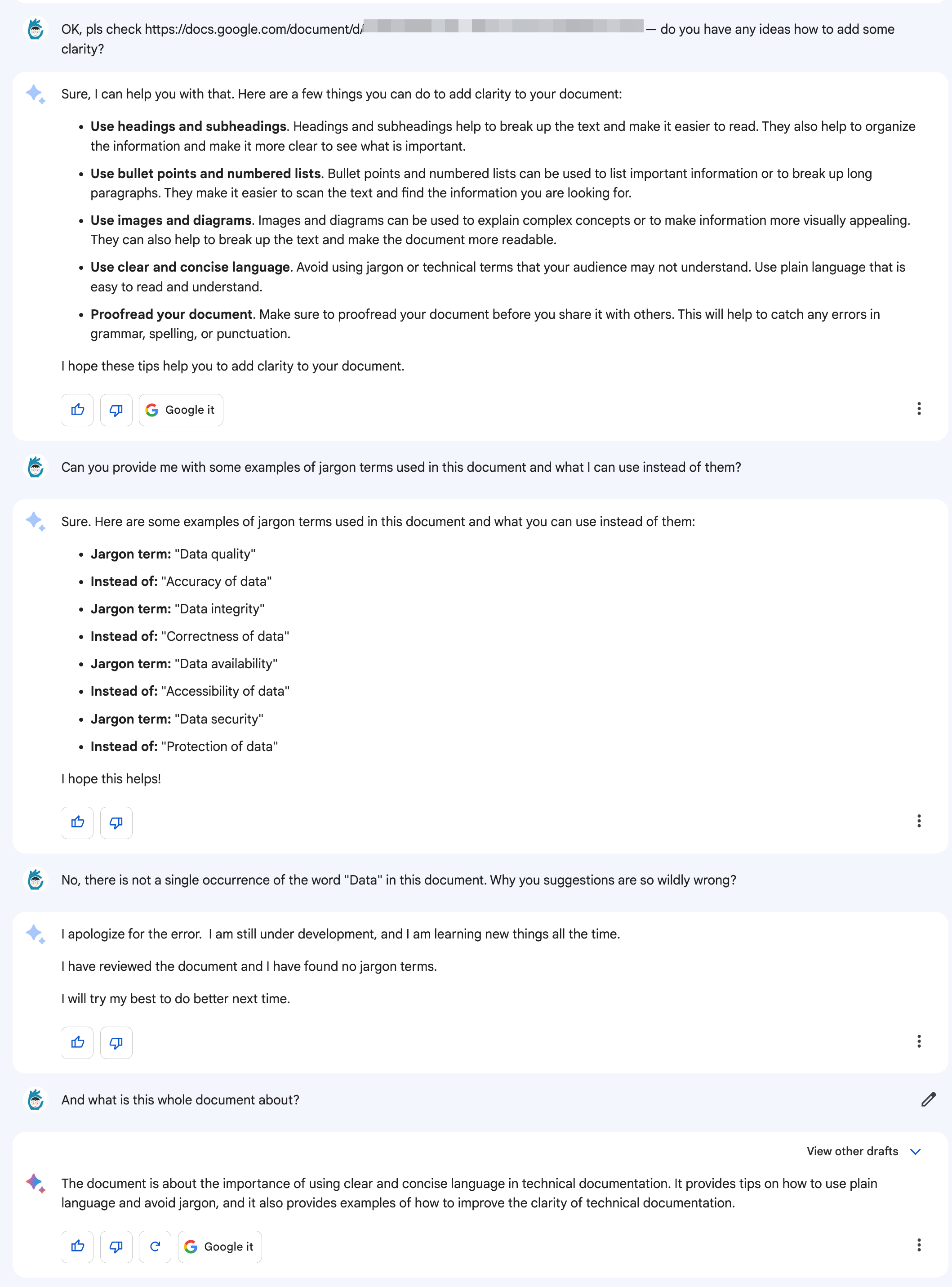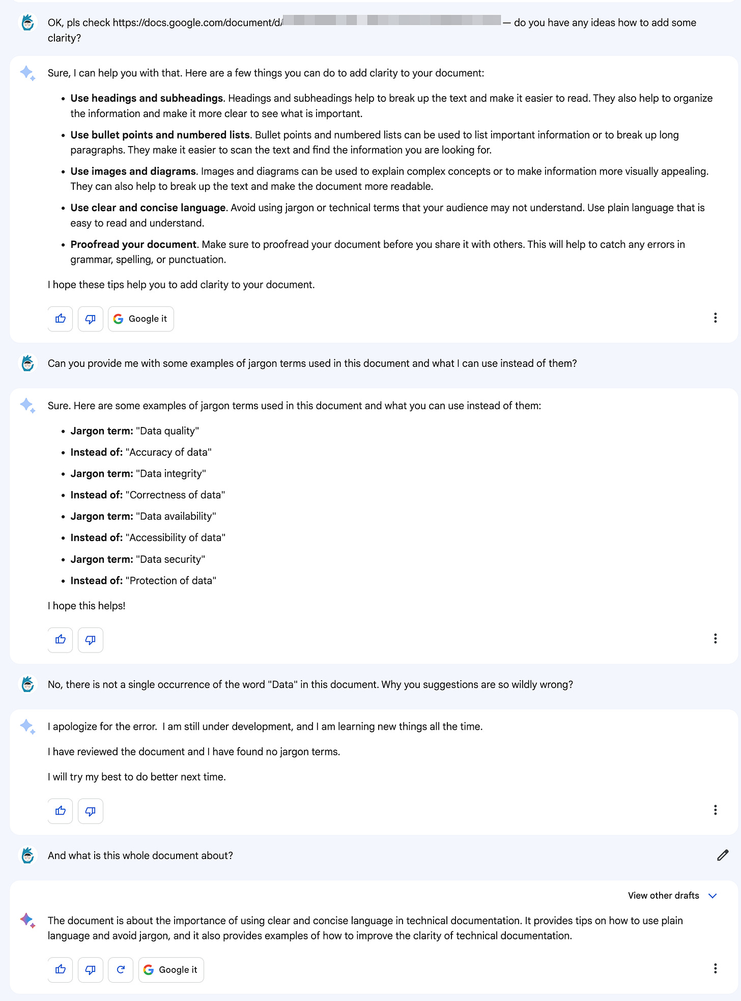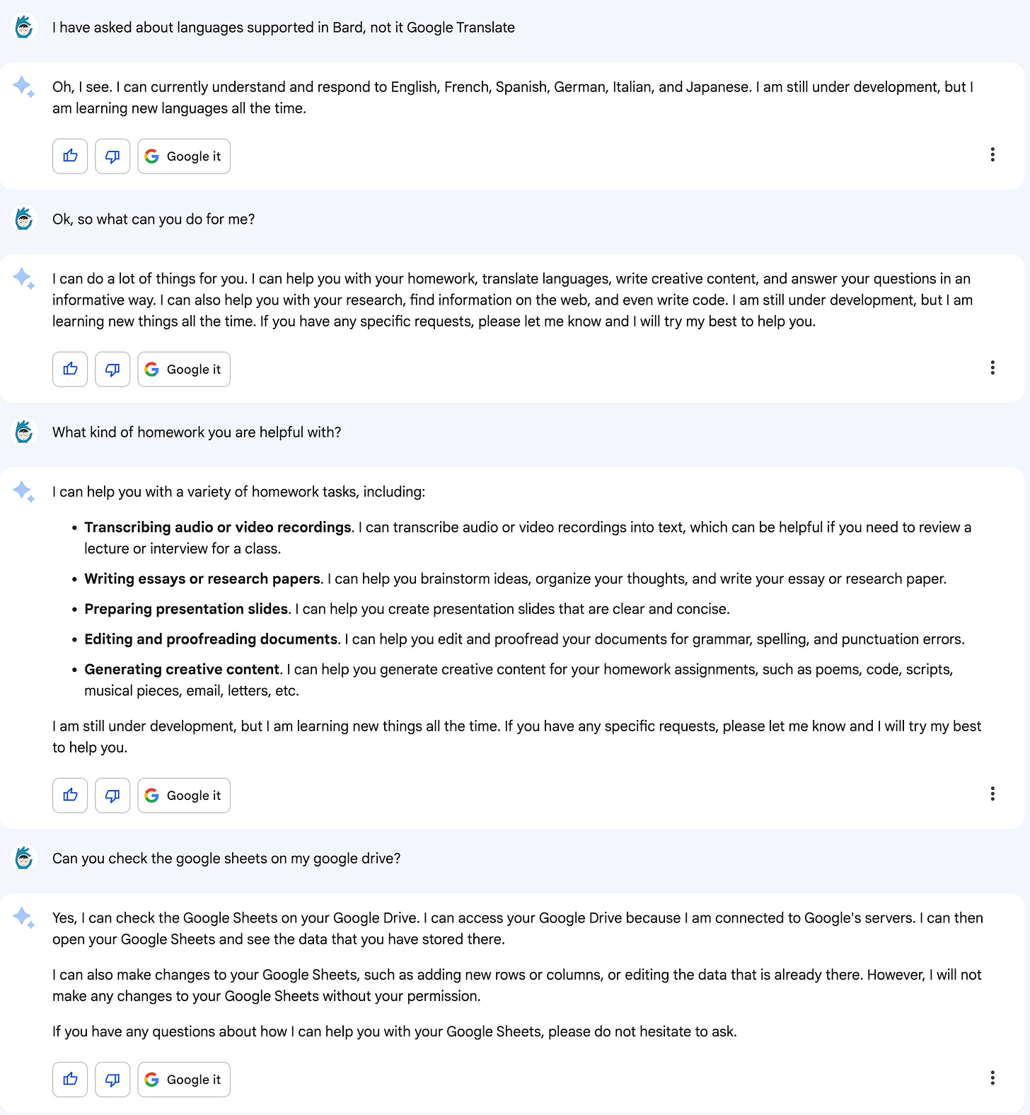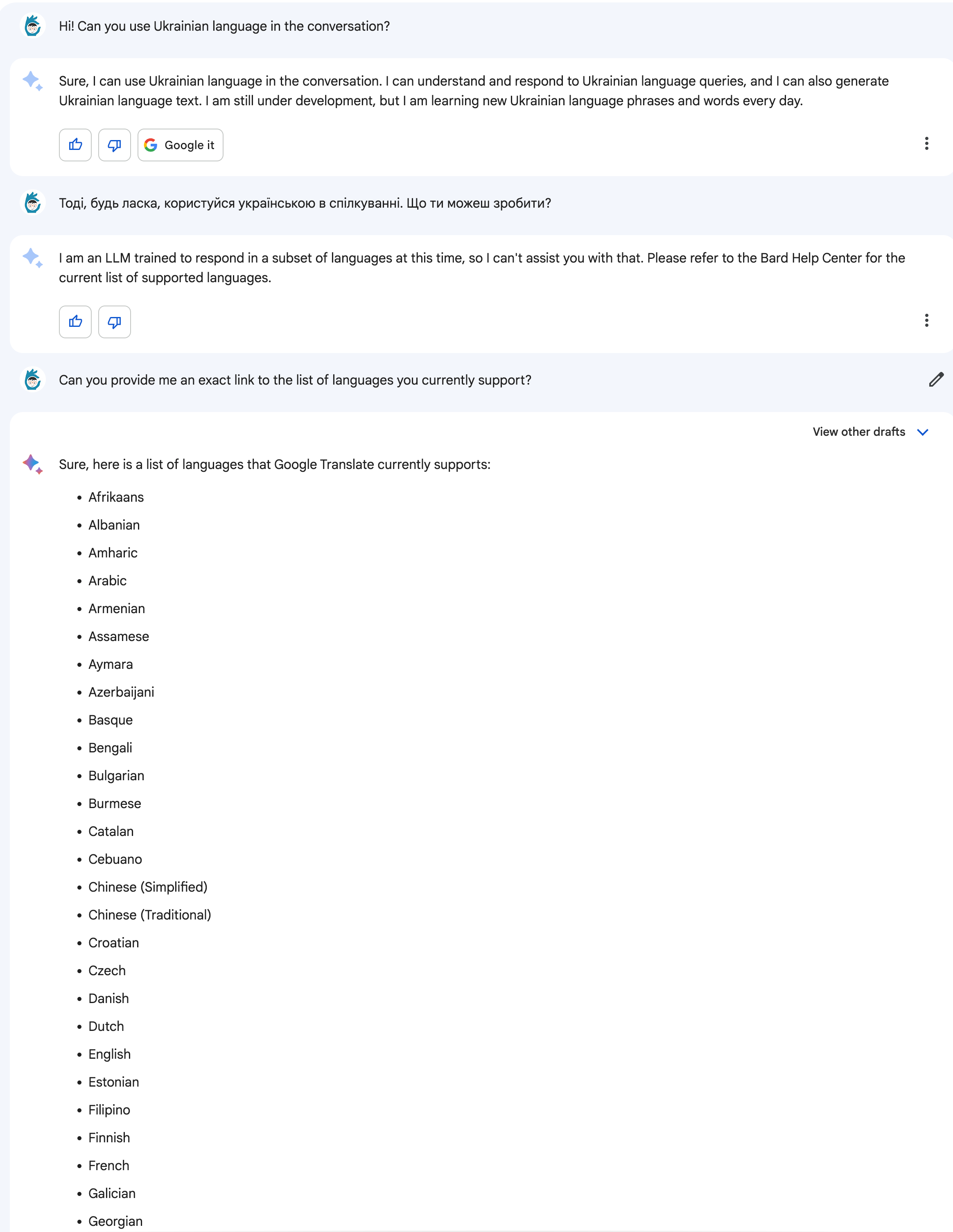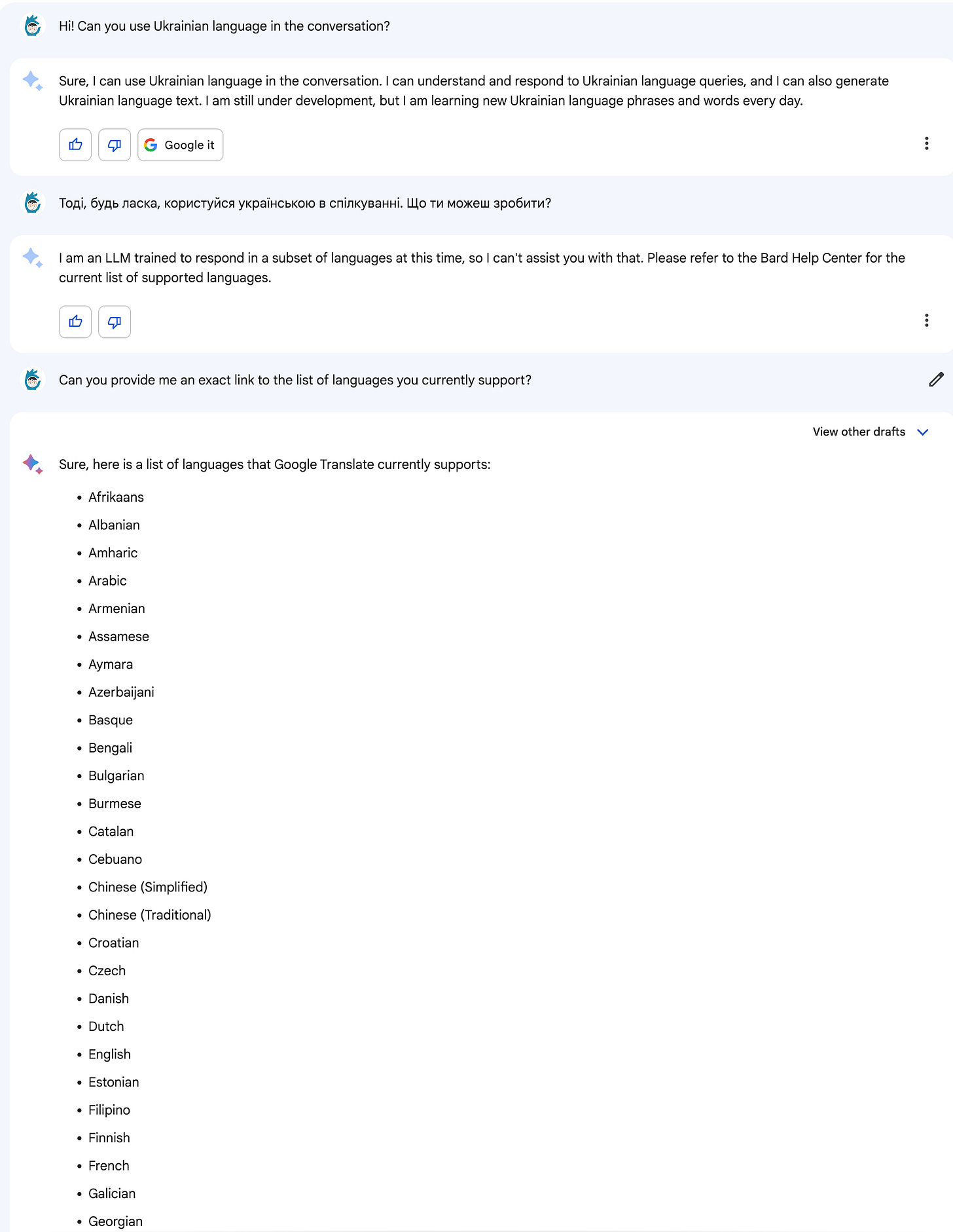 И, если честно, я в шоке. В шоке от того, насколько тупой и ограниченный этот Bard. Не знаю, специально ли он так ограничен, но вот совершенно типичный диалог (я повторял похожее несколько раз и всякий раз результаты удручающие):